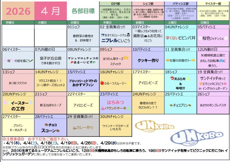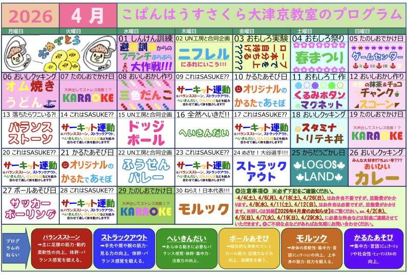 4月の活動プログラムができました。 2026/03/04 2026年4月の活動プログラムができましたので、お知らせします。 ◆大津京教室◆ ☞PDFはこちら ◆UN工房◆ ☞PDFはこちら 皆さまのご参加、楽しみにお待ちしております。 こぱんはうすさくら大津京教室 こぱんはうすさくらUN工房